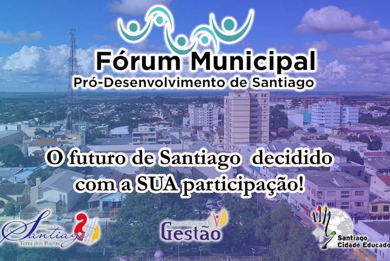 Toda a comunidade é convidada a participar do 3º Fórum Municipal Pró-Desenvolvimento de Santiago, que inicia na próxima segunda, dia 24 de abril. O evento pretende atrair todos os segmentos sociais para debater temas relacionados a todas as áreas da administração municipal. Conforme o secretário de Gestão, Éldrio Machado, serão discutidas metas da administração municipal em conjunto com a comunidade, que poderá apontar as ações que considera prioritárias para serem executadas. Tudo servirá como base para a elaboração do Plano Plurianual 2018-2021. O Fórum será marcado também por importantes palestras com personalidades renomadas, como Paulo Ziulcoski, da Confederação Nacional dos Município.